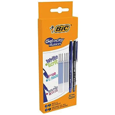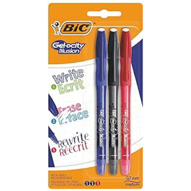 Los bolígrafos BIC Gel-ocity Illusion utilizan tinta de gel termosesible, la cual se desvanece con el calor que genera la friccion de la goma que incorporan en su extremo superior.